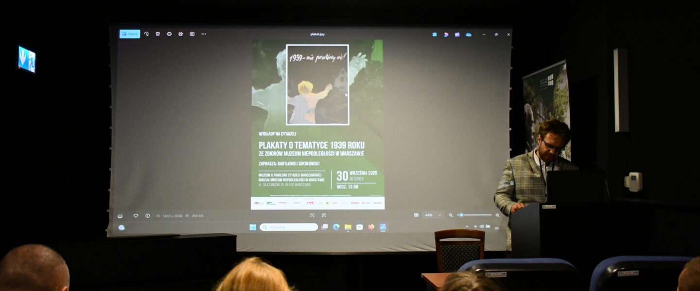 Wykład poprowadził 𝐁𝐚𝐫𝐭ł𝐨𝐦𝐢𝐞𝐣 𝐒𝐨𝐤𝐨ł𝐨𝐰𝐬𝐤𝐢, który omówił rolę plakatu jako medium łączącego sztukę, edukację i mobilizację społeczną. Uczestnicy mogli zobaczyć m.in. litografię Felicjana Szczęsnego Kowarskiego „Ludu Polski! Chwyć za broń…” oraz prace Adama Siemaszko.