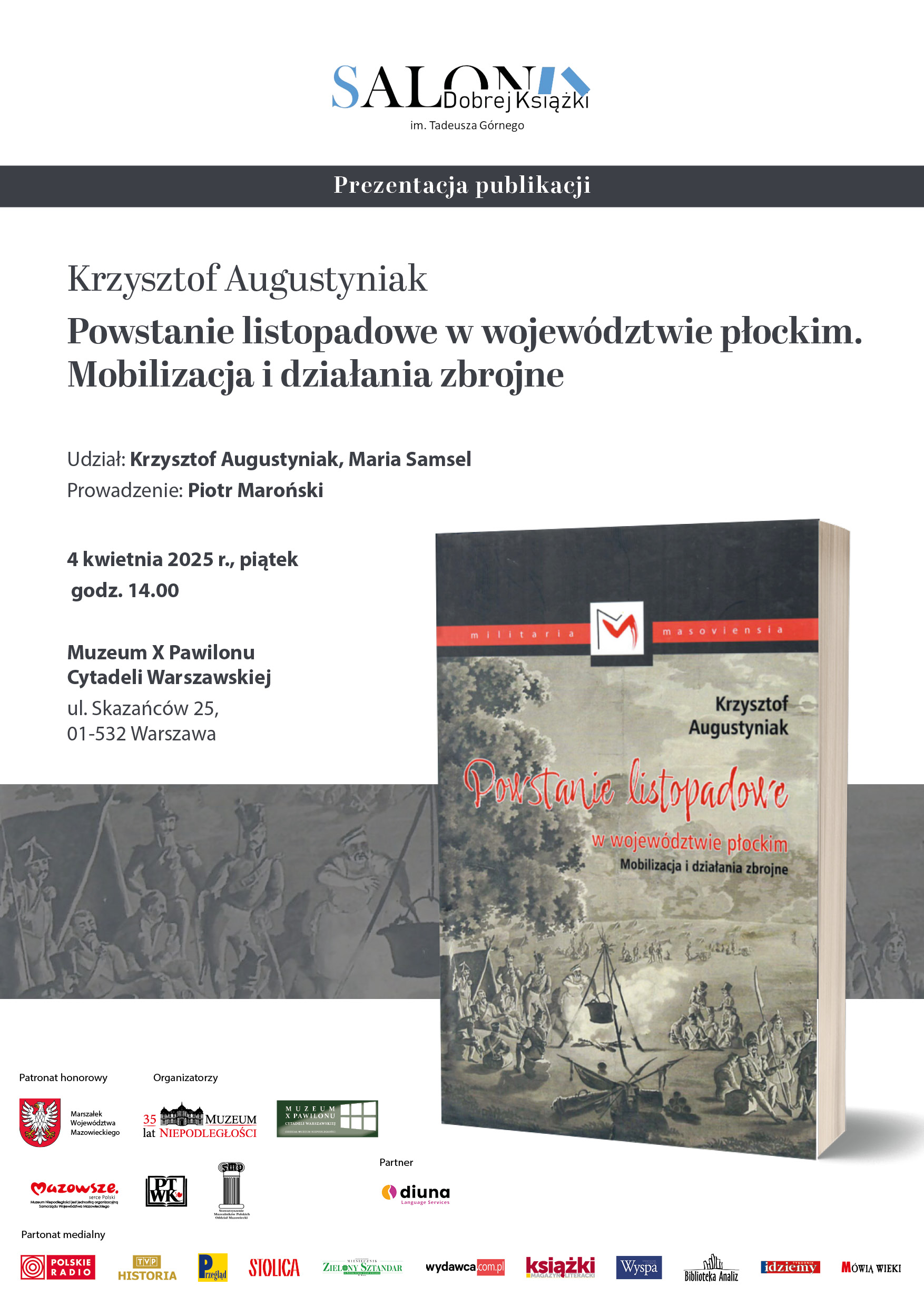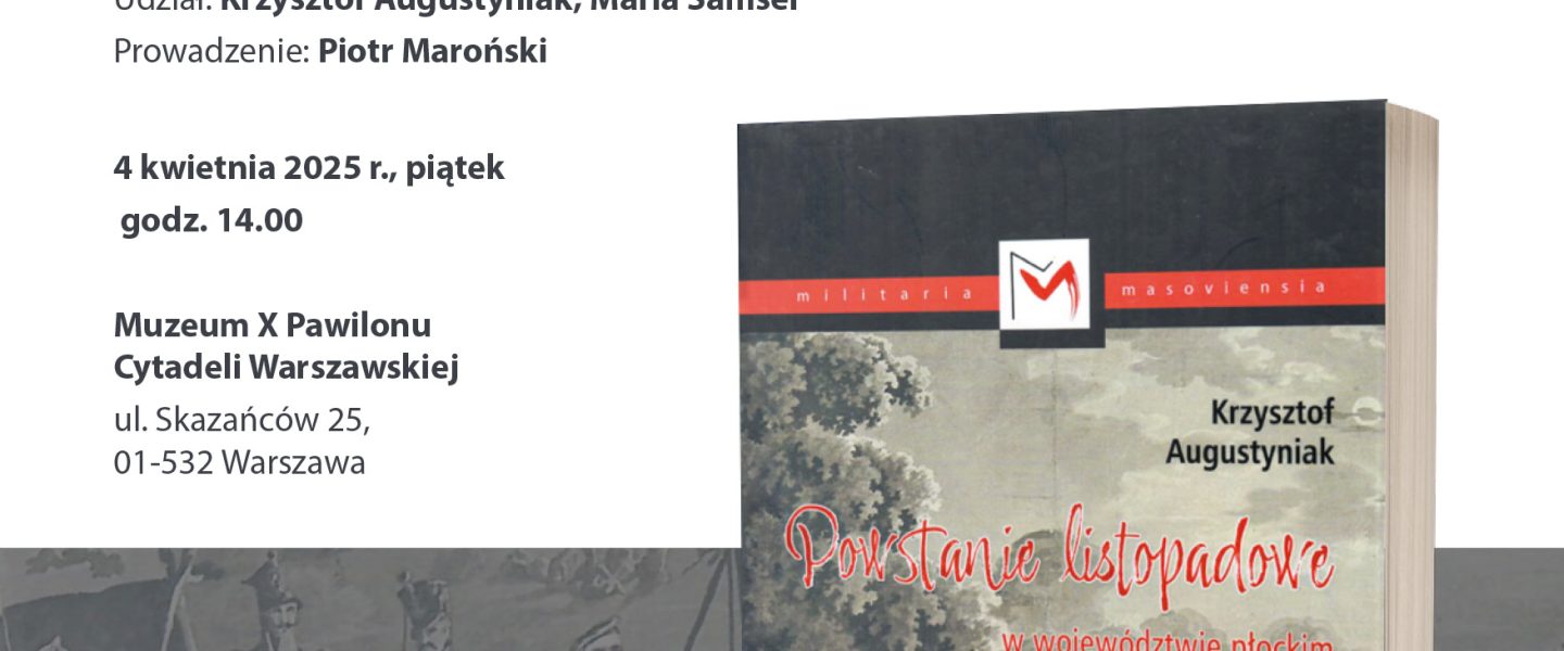 Serdecznie zapraszamy 4 kwietnia na godz. 14:00, na kolejne spotkanie z cyklu 𝑺𝒂𝒍𝒐𝒏 𝑫𝒐𝒃𝒓𝒆𝒋 𝑲𝒔𝒊𝒂̨𝒛̇𝒌𝒊 𝒊𝒎. 𝑻. 𝑮𝒐́𝒓𝒏𝒆𝒈𝒐, podczas którego porozmawiamy o książce Krzysztofa Augustyniaka „Powstanie listopadowe w województwie płockim. Mobilizacja i działania zbrojne”