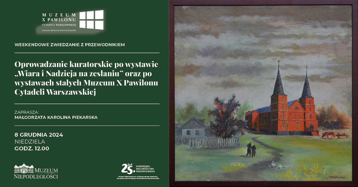W niedzielę, 8 grudnia 2024 r., o godzinie 12:00 odbędzie się oprowadzanie po wystawach. To okazja, by poznać historię Cytadeli Warszawskiej, zobaczyć malarstwo Aleksandra Sochaczewskiego i zgłębić losy polskich zesłańców na wystawie czasowej „Wiara i Nadzieja na zesłaniu”.